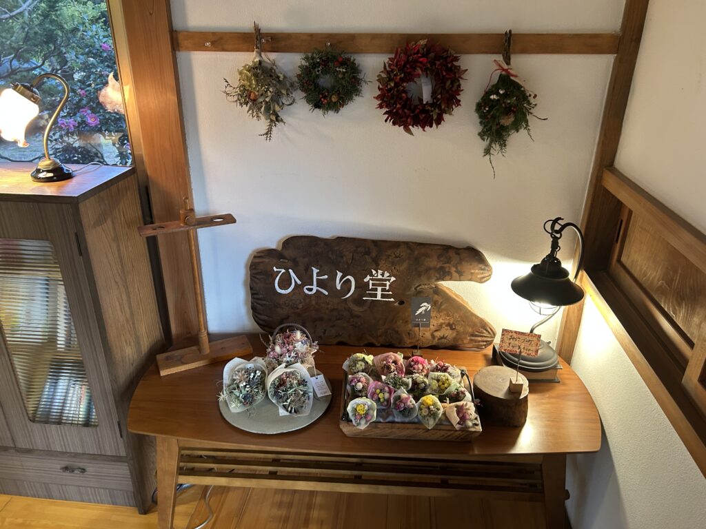 飲食スペース以外にも、ドライフラワー手仕事作家ユニット「ひより堂」のブースやステンドグラス、陶器などの雑貨コーナーも用意する。