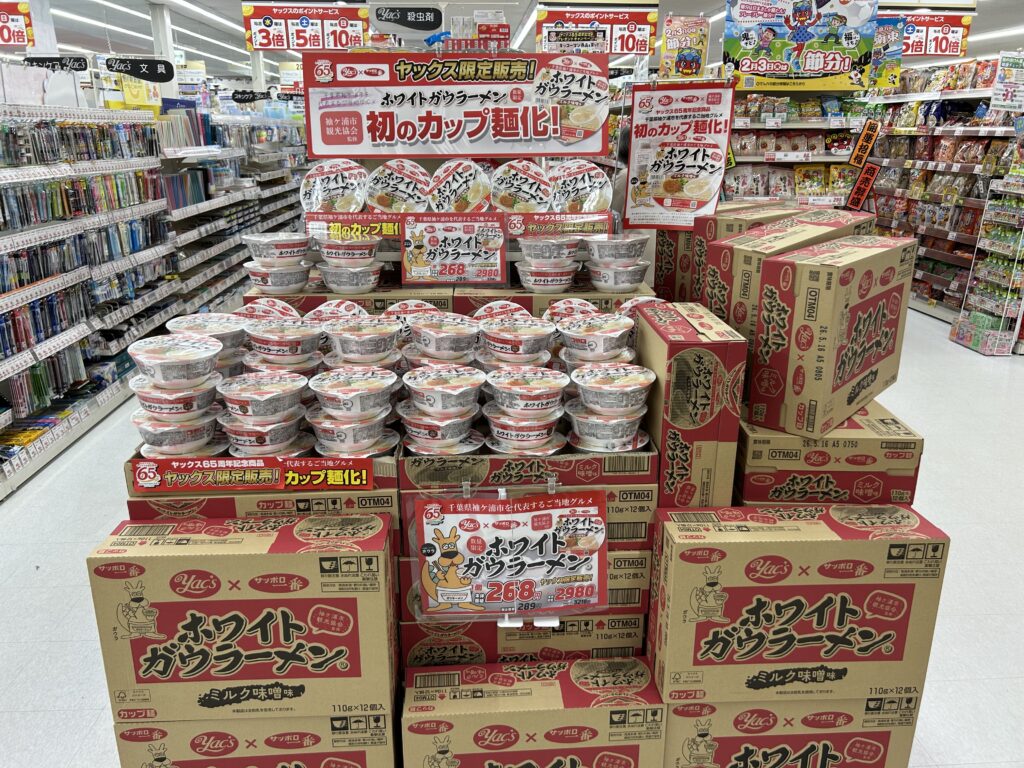 袖ケ浦市観光協会が監修し、千葉薬品とサンヨー食品が共同開発した「ホワイトガウラーメン」のカップ麺